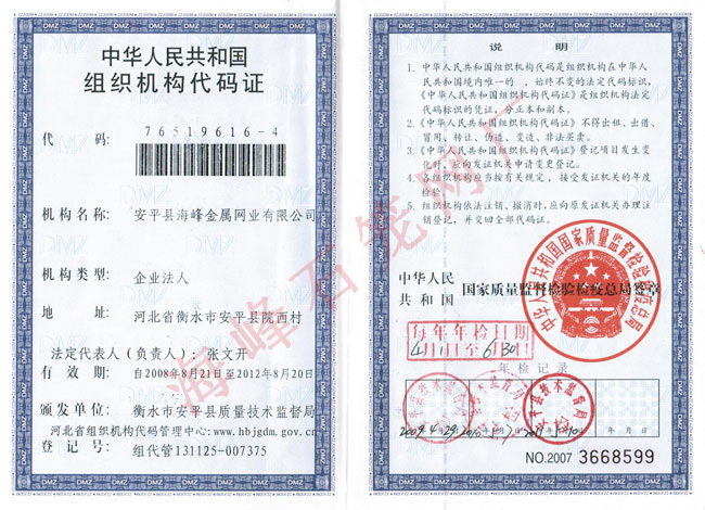 - 安平縣海峰金屬網(wǎng)業(yè)有限公司 安平縣海峰金屬網(wǎng)業(yè)有限公司位于中國(guó)著名的“絲網(wǎng)之鄉(xiāng)”——河北省安平縣,是具有拉絲織網(wǎng)、焊接、剪裁、噴塑、浸塑成品等一整套生產(chǎn)工藝的專業(yè)化廠家。本公司經(jīng)過多年來的順勢(shì)發(fā)展,現(xiàn)已擁有廣闊的生產(chǎn)廠房和優(yōu)良的辦公環(huán)境,占地8500平方米,在廠職工100余人。擁有高深的技術(shù)人員,高端的生產(chǎn)設(shè)備,全自動(dòng)的機(jī)械化生產(chǎn)流水線,站在了軋花網(wǎng)、石籠網(wǎng)同行業(yè)的頂端。 查看更多>>