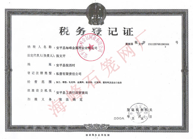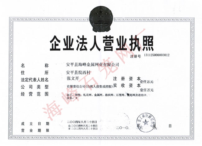 - 安平縣海峰金屬網(wǎng)業(yè)有限公司 安平縣海峰金屬網(wǎng)業(yè)有限公司位于中國(guó)著名的“絲網(wǎng)之鄉(xiāng)”——河北省安平縣,是具有拉絲織網(wǎng)、焊接、剪裁、噴塑、浸塑成品等一整套生產(chǎn)工藝的專業(yè)化廠家。本公司經(jīng)過多年來的順勢(shì)發(fā)展,現(xiàn)已擁有廣闊的生產(chǎn)廠房和優(yōu)良的辦公環(huán)境,占地8500平方米,在廠職工100余人。擁有高深的技術(shù)人員,高端的生產(chǎn)設(shè)備,全自動(dòng)的機(jī)械化生產(chǎn)流水線,站在了軋花網(wǎng)、石籠網(wǎng)同行業(yè)的頂端。 查看更多>>